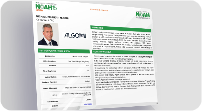 Insurance & Finance MICHAEL SCHMIDT | ALGOMI Co-founder & CEO SPEAKER BIO Michael’s background includes a 14-year career at Deutsche Bank and a 10-year at UBS, always heading Fixed Income Trading and Sales teams regionally and globally. His last positions at UBS were Co-Head of European Credit Trading, Global Head of UBS FI Retail Trading and member of the IB board of UBS Switzerland. His teams pioneered numerous leading electronic trading platforms including DB Autobahn, UBS Wealth Management/Investment Bank Connectivity Hub in addition to introducing the first algorithmic pricing tools in Corporate Bonds. Michael holds a degree in Economics from University of Dusseldorf. KEY CORPORATE FACTS& KPIs COMPANY OVERVIEW Headquarters London, United Kingdom Algomi creates the network that enables all market participants to securely and intelligently harness data to make valuable financial trading connections. Office Locations New York, Chicago, Hong Kong In the ever-changing landscape of capital, leverage and liquidity requirements, Algomi’s revolutionary technology empowers fixed income professionals to fulfil their precise needs, for Founded 2012 both sides of the market. By maximising the relationships between salespeople, traders and investors, the Algomi No of Employees 120 Honeycomb suite of scalable software greatly increases the opportunities and velocity in large and illiquid voice trades between banks and institutional investors. Active Markets Europe, North America, SE Asia, Australia With tenacity and integrity, Algomi unlocks the full potential of the fixed income market through pioneering and pragmatic technology. Business Overview FinTech WeareAlgomiandwewanttoshowyouwhat’snext. Algomi was founded in 2012 by Stu Taylor (Former Global Head of Matched Principal Trading and creator of PIN-FI at UBS), Usman Khan and Robert Howes (Founders of CAPXD), and Recent Milestones 10 sell side banks, 50 buy side investors Michael Schmidt (Former Head of European Credit Trading and IB Board Member at UBS. Backed by investmentfrom Lakestar and an exceptional panel KPI#1 Awarded “Trading technology product of the year” in 2014 Key Investors Lakestar Website algomi.com 15