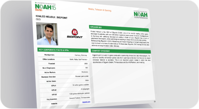 Media, Telecom & Gaming KHALED HELIOUI | BIGPOINT CEO SPEAKER BIO Khaled Helioui is the CEO of Bigpoint GmbH, one of the world's leading online game developer & publisher with over 350 million registered users across the world. Headquartered in Hamburg with additional development studios in Berlin & Lyon, Bigpoint has a team of passionate developers, artists and designers aspiring to shape the future of online gaming. Before joining Bigpoint in 2012, Khaled was an investor focusing on the technology space. He was involved in number of investments at TA Associates (Bigpoint, ION Trading) and was also active as an angel investor (Uber, Boticca). KEY CORPORATE FACTS& KPIs COMPANY OVERVIEW Headquarters Hamburg, Germany Bigpoint.com is a web 2.0 game portal with a community of more than 340 million players. The extreme flexibility of browser games sets them apart due to the fact that they can be played Office Locations Berlin, Malta, San Francisco wherever Internet is available. This is an important growth market in which the main Founded 2002 stockholders of Bigpoint GmbH, TA Associatesand Summit Partners, are investing. No of Employees 500 Active Markets Worldwide Business Overview Browser game portal Active Users 340m KPI#1 50 online games available KPI #2 25 languages KPI #3 1000 global distribution partners Key Investors Summit Partners, TA Associates Website bigpoint.com 28