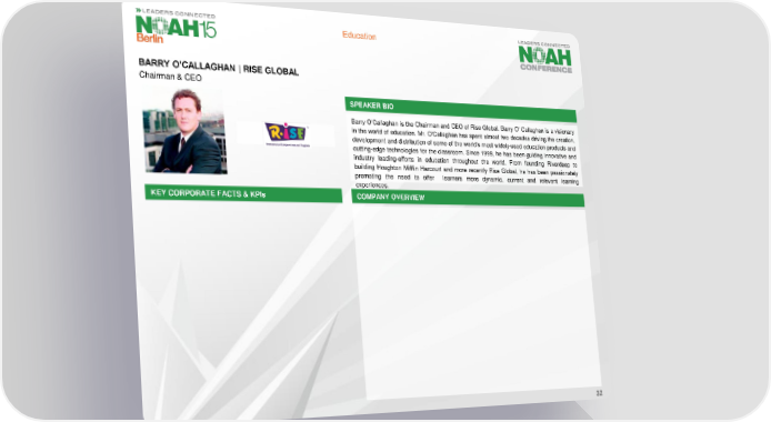 Education BARRY O’CALLAGHAN | RISE GLOBAL Chairman & CEO SPEAKER BIO Barry O’Callaghan is the Chairman and CEO of Rise Global. Barry O’ Callaghan is a visionary in the world of education. Mr. O’Callaghan has spent almost two decades driving the creation, development and distribution of some of the world’s most widely-used education products and cutting-edge technologies for the classroom. Since 1999, he has been guiding innovative and industry leading-efforts in education throughout the world. From founding Riverdeep to building Houghton Mifflin Harcourt and more recently Rise Global, he has been passionately promoting the need to offer learners more dynamic, current and relevant learning experiences. KEY CORPORATE FACTS& KPIs COMPANY OVERVIEW 32