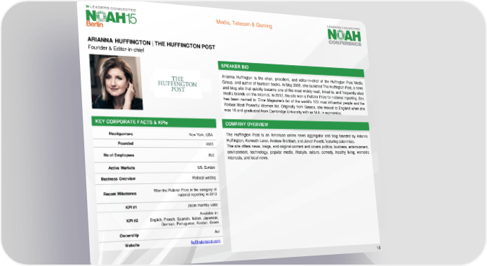 Media, Telecom & Gaming ARIANNA HUFFINGTON | THE HUFFINGTON POST Founder & Editor-in-chief SPEAKER BIO Arianna Huffington is the chair, president, and editor-in-chief of the Huffington Post Media Group, and author of fourteen books. In May 2005, she launched The Huffington Post, a news and blog site that quickly became one of the most widely-read, linked to, and frequently-cited media brands on the Internet. In 2012, the site won a Pulitzer Prize for national reporting. She has been named to Time Magazine's list of the world’s 100 most influential people and the Forbes Most Powerful Women list. Originally from Greece, she moved to England when she was16andgraduatedfromCambridge Universitywithan M.A. in economics. KEY CORPORATE FACTS& KPIs COMPANY OVERVIEW Headquarters New York, USA The Huffington Post is an American online news aggregator and blog founded by Arianna Founded 2005 Huffington, Kenneth Lerer, Andrew Breitbart, and Jonah Peretti, featuring columnists. The site offers news, blogs, and original content and covers politics, business, entertainment, No of Employees 850 environment, technology, popular media, lifestyle, culture, comedy, healthy living, women's interests, and local news. Active Markets US,Europe Business Overview Political weblog Recent Milestones Won the Pulitzer Prize in the category of national reporting in 2012 KPI#1 260m monthly visits Available in: KPI #2 English, French, Spanish, Italian, Japanese, German, Portuguese, Korean, Greek Ownership Aol Website huffingtonpost.com 18