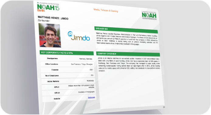 Media, Telecom & Gaming MATTHIAS HENZE | JIMDO Co-founder SPEAKER BIO Matthias Henze studied Business Administration in Kiel and Gothenburg before founding Jimdo together with Fridtjof Detzner and Christian Springub. The three of them moved into an old farmhouse owned by Fridtjof’s parents to found their first company in 2004, followed by Jimdo in 2007. Matthias is mainly taking care of Jimdo’s marketing activities and it’s international teams since Jimdo is fully localized in 9 languages. KEY CORPORATE FACTS& KPIs COMPANY OVERVIEW Headquarters Hamburg, Germany Jimdo is an intuitive and free to use website builder. Founded in 2007 and profitable since 2009 with only 500k of seed funding, Jimdo now has a passionate team of 200 people in Office Locations San Francisco, Tokyo, Shanghai Hamburg, San Francisco and Tokyo. The company has managed to scale rapidly whilst remaining bootstrapped, having turned down an eight-figure offer in 2012. Jimdo recently Founded 2007 entered the mobile space with Jimdo for iOS, setting new standards in cross-platform website creation. No of Employees 200 Active Markets Worldwide KPI#1 Helped more than 12m people to build websites KPI #2 Availabla in 9 languages Website jimdo.com 24