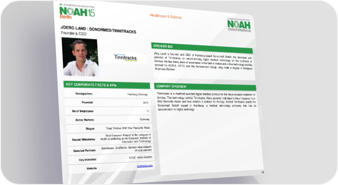 Healthcare & Science JOERG LAND | SONORMED/TINNITRACKS Founder & CEO SPEAKER BIO Jörg Land is founder and CEO of Hamburg-based Sonormed GmbH, the developer and provider of Tinnitracks, an award-winning digital medical technology for the treatment of tinnitus. He has many years of experience in the field of mobile and online technology and has worked for NOKIA, OTTO and the Bertelsmann Group. Jörg holds a degree in European Business Studies. KEY CORPORATE FACTS& KPIs COMPANY OVERVIEW Headquarters Hamburg Germany Tinnitracks is a manifold awarded digital medical product for the neuro-acoustic treatment of tinnitus. The technology behind Tinnitracks filters patients' individual tinnitus frequency from Founded 2012 their favourite music and thus renders it suitable for therapy. Behind Tinnitracks stands the Sonormed GmbH based in Hamburg, a medical technology company that has its No of Employees 11 specialization in digital audiology. Active Markets Germany Slogan Treat Tinnitus With Your Favourite Music Best European Project” in the category of Recent Milestones health & wellbeing at the European Institute of Innovation and Technology Selected Partners Sennheiser, DocMorris, German wide network of local partners Key Investors HTGF, Heiko Hubertz Website tinnitracks.com 46