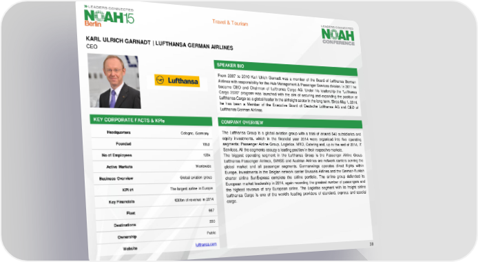 Travel & Tourism KARL ULRICH GARNADT | LUFTHANSA GERMAN AIRLINES CEO SPEAKER BIO From 2007 to 2010 Karl Ulrich Garnadt was a member of the Board of Lufthansa German Airlines with responsibility for the Hub Management & Passenger Services division. In 2011 he became CEO and Chairman of Lufthansa Cargo AG. Under his leadership the “Lufthansa Cargo 2020” program was launched with the aim of securing and expanding the position of Lufthansa Cargo as a global leader in the airfreight sector in the long term. Since May 1, 2014, he has been a Member of the Executive Board of Deutsche Lufthansa AG and CEO of Lufthansa German Airlines. KEY CORPORATE FACTS& KPIs COMPANY OVERVIEW Headquarters Cologne, Germany The Lufthansa Group is a global aviation group with a total of around 540 subsidiaries and equity investments, which in the financial year 2014 were organised into five operating Founded 1953 segments: Passenger Airline Group, Logistics, MRO, Catering and, up to the end of 2014, IT Services. All the segments occupy a leading position in their respective markets. No of Employees 120k The biggest operating segment in the Lufthansa Group is the Passenger Airline Group. Lufthansa Passenger Airlines, SWISS and Austrian Airlines are network carriers serving the Active Markets Worldwide global market and all passenger segments. Germanwings operates direct flights within Europe. Investments in the Belgian network carrier Brussels Airlines and the German-Turkish Business Overview Global aviation group charter airline SunExpress complete the airline portfolio. The airline group defended its KPI#1 The largest airline in Europe European market leadership in 2014, again recording the greatest number of passengers and the highest revenue of any European airline. The Logistics segment with its freight airline Key Financials €30bn of revenue in 2014 Lufthansa Cargo is one of the world’s leading providers of standard, express and special cargo. Fleet 667 Destinations 220 Ownership Public Website lufthansa.com 39