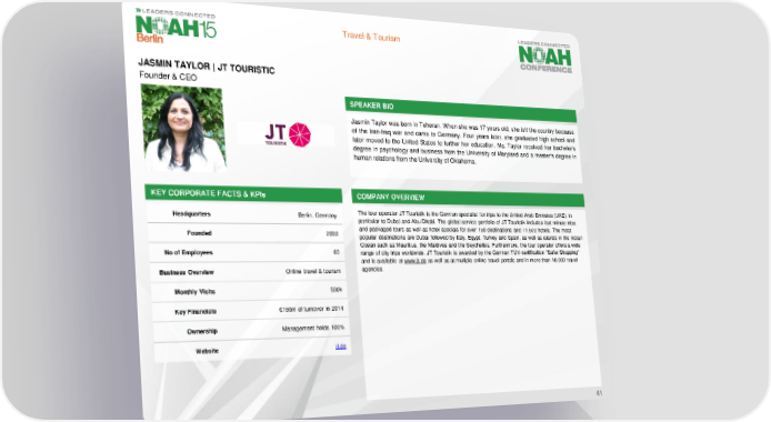 Travel & Tourism JASMIN TAYLOR | JT TOURISTIC Founder & CEO SPEAKER BIO Jasmin Taylor was born in Teheran. When she was 17 years old, she left the country because of the Iran-Iraq war and came to Germany. Four years later, she graduated high school and later moved to the United States to further her education. Ms. Taylor received her bachelor’s degree in psychology and business from the University of Maryland and a master’s degree in humanrelations from the University of Oklahoma. KEY CORPORATE FACTS& KPIs COMPANY OVERVIEW Headquarters Berlin, Germany The tour operator JT Touristik is the German specialist for trips to the United Arab Emirates (UAE), in particular to Dubai and Abu Dhabi. The global service portfolio of JT Touristik includes last minute trips Founded 2009 and packaged tours as well as hotel specials for over 150 destinations and 11,500 hotels. The most popular destinations are Dubai followed by Italy, Egypt, Turkey and Spain, as well as islands in the Indian Ocean such as Mauritius, the Maldives and the Seychelles. Furthermore, the tour operator offers a wide No of Employees 60 range of city trips worldwide. JT Touristik is awarded by the German TÜV-certification "Safer Shopping” and is available at www.jt.de as well as at multiple online travel portals and in more than 10,000 travel Business Overview Online travel & tourism agencies. Monthly Visits 500k Key Financials €150m of turnover in 2014 Ownership Management holds 100% Website jt.de 41