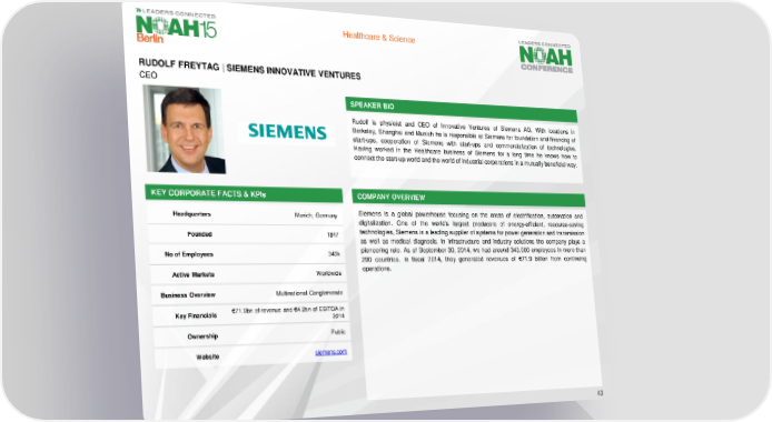 Healthcare & Science RUDOLF FREYTAG | SIEMENS INNOVATIVE VENTURES CEO SPEAKER BIO Rudolf is physicist and CEO of Innovative Ventures of Siemens AG. With locations in Berkeley, Shanghai and Munich he is responsible at Siemens for foundation and financing of start-ups, cooperation of Siemens with start-ups and commercialization of technologies. Having worked in the Healthcare business of Siemens for a long time he knows how to connect the start-up world and the world of industrial corporations in a mutually beneficial way. KEY CORPORATE FACTS& KPIs COMPANY OVERVIEW Headquarters Munich, Germany Siemens is a global powerhouse focusing on the areas of electrification, automation and digitalization. One of the world’s largest producers of energy-efficient, resource-saving Founded 1847 technologies, Siemens is a leading supplier of systems for power generation and transmission as well as medical diagnosis. In infrastructure and industry solutions the company plays a No of Employees 343k pioneering role. As of September 30, 2014, we had around 343,000 employees in more than 200 countries. In fiscal 2014, they generated revenues of €71.9 billion from continuing Active Markets Worldwide operations. Business Overview Multinational Conglomerate Key Financials €71.9bn of revenue and €4.2bn of EBITDA in 2014 Ownership Public Website siemens.com 43
