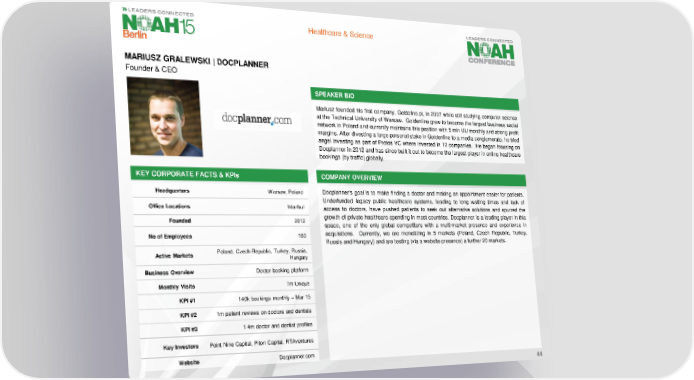Healthcare & Science MARIUSZ GRALEWSKI | DOCPLANNER Founder & CEO SPEAKER BIO Mariusz founded his first company, Goldeline.pl, in 2007 while still studying computer science at the Technical University of Warsaw. Goldenline grew to become the largest business social network in Poland and currently maintains this position with 5 mln UU monthly and strong profit margins. After divesting a large personal stake in Goldenline to a media conglomerate, he tried angel investing as part of Protos VC where invested in 10 companies. He began focusing on Docplanner in 2012 and has since built it out to become the largest player in online healthcare bookings (by traffic) globally. KEY CORPORATE FACTS& KPIs COMPANY OVERVIEW Headquarters Warsaw, Poland Docplanner’s goal is to make finding a doctor and making an appointment easier for patients. Underfunded legacy public healthcare systems, leading to long waiting times and lack of Office Locations Istanbul access to doctors, have pushed patients to seek out alternative solutions and spurred the Founded 2012 growth of private healthcare spending in most countries. Docplanner is a leading player in this space, one of the only global competitors with a multi-market presence and experience in No of Employees 160 acquisitions. Currently, we are monetizing in 5 markets (Poland, Czech Republic, Turkey, Russia and Hungary) and are testing (via a website presence) a further 20 markets. Active Markets Poland, Czech Republic, Turkey, Russia, Hungary Business Overview Doctor booking platform Monthly Visits 7m Unique KPI#1 140k bookings monthly – Mar 15 KPI #2 1m patient reviews on doctors and dentists KPI #3 1.4m doctor and dentist profiles Key Investors Point Nine Capital, Piton Capital, RTAventures Website Docplanner.com 44