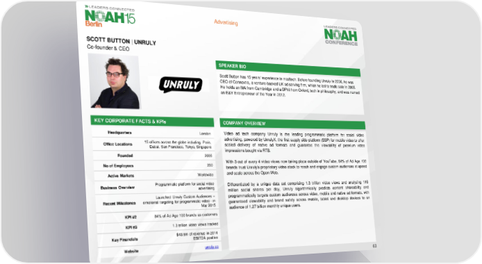 Advertising SCOTT BUTTON | UNRULY Co-founder & CEO SPEAKER BIO Scott Button has 15 years’ experience in madtech. Before founding Unruly in 2006, he was CEO of Connextra, a venture-backed UK ad serving firm, which he led to trade sale in 2005. He holds an MA from Cambridge and a BPhil from Oxford, both in philosophy, and was named an E&Y Entrepreneur of the Year in 2012. KEY CORPORATE FACTS& KPIs COMPANY OVERVIEW Headquarters London Video ad tech company Unruly is the leading programmatic platform for social video 15 offices across the globe including, Paris, advertising, powered by UnrulyX, the first supply side platform (SSP) for mobile video to offer Office Locations Dubai, San Francisco, Tokyo, Singapore scaled delivery of native ad formats and guarantee the viewability of premium video impressions bought via RTB. Founded 2006 No of Employees 200 With 3 out of every 4 video views now taking place outside of YouTube, 84% of Ad Age 100 brands trust Unruly’s proprietary video stack to reach and engage custom audiences at speed Active Markets Worldwide and scale across the Open Web. Business Overview Programmatic platform for social video Differentiated by a unique data set comprising 1.3 trillion video views and analyzing 116 advertising million social shares per day, Unruly algorithmically predicts content shareability and Launched Unruly Custom Audiences – programmatically targets custom audiences across video, mobile and native ad formats, with Recent Milestones emotional targeting for programmatic video - in guaranteed viewability and brand safety across mobile, tablet and desktop devices to an Mar 2015 audience of 1.27 billion monthly unique users. KPI #2 84% of Ad Age 100 brands as customers KPI #3 1.3 trillion video views tracked Key Financials $43.6m of revenue in 2014 EBITDA positive Website unruly.co 63