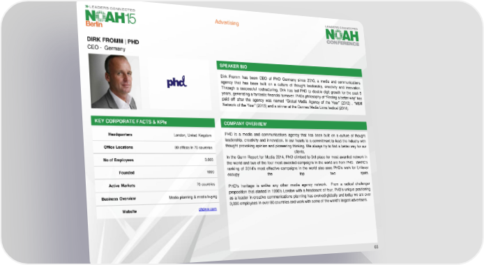 Advertising DIRK FROMM | PHD CEO - Germany SPEAKER BIO Dirk Fromm has been CEO of PHD Germany since 2010, a media and communications agency that has been built on a culture of thought leadership, creativity and innovation. Through a successful restructuring, Dirk has led PHD to double digit growth for the past 5 years, generating a fantastic financial turnover. PHDs philosophy of “Finding a better way” has paid off after the agency was named “Global Media Agency of the Year” (2012) , “M&M Network of the Year” (2013) and a winner at the Cannes Media Lions festival (2014). KEY CORPORATE FACTS& KPIs COMPANY OVERVIEW Headquarters London, United Kingdom PHD is a media and communications agency that has been built on a culture of thought leadership, creativity and innovation. In our hearts is a commitment to lead the industry with Office Locations 80 offices in 70 countries thought provoking opinion and pioneering thinking. We always try to find a better way for our clients. No of Employees 3,000 In the Gunn Report for Media 2014, PHD climbed to 3rd place for most awarded network in the world and two of the four most awarded campaigns in the world are from PHD. WARC’s Founded 1990 ranking of 2014’s most effective campaigns in the world also sees PHD’s work for Unilever occupy the top two spots. Active Markets 70 countries PHD’s heritage is unlike any other media agency network. From a radical challenger Business Overview Media planning & media buying proposition that started in 1990’s London with a headcount of four, PHD’s unique positioning as a leader in creative communications planning has evolved globally and today we are over 3,000 employees in over 80 countries and work with some of the world’s largest advertisers. Website phdww.com 65