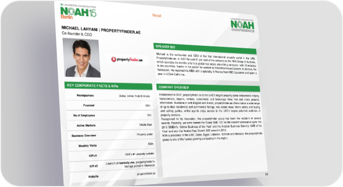 Retail MICHAEL LAHYANI | PROPERTYFINDER.AE Co-founder & CEO SPEAKER BIO Michael is the co-founder and CEO of the first international property portal in the UAE, Propertyfinder.ae. In 2007 he sold 51 per cent of the company to the REA Group of Australia, which operates the world’s only truly global real estate advertising company - with 18 websites in ten countries. Earlier in his career he worked at PriceWaterhouseCoopers in Geneva, his hometown. He received his MBA with a specialty in finance from HEC Lausanne and spent a year in UCLA California. KEY CORPORATE FACTS& KPIs COMPANY OVERVIEW Headquarters Dubai, United Arab Emirates Established in 2007, propertyfinder.ae is the UAE’s largest property portal dedicated to helping homeowners, buyers, renters, consultants and brokerage firms find and share property information. Available in both English and Arabic, propertyfinder.ae offers visitors a wide range Founded 2007 of up-to-date residential and commercial listings, real estate news, home advice and buying and selling guides, whilst agents enjoy access to the UAE’s largest potential audience of No of Employees 200 property seekers. Recognized for its innovation, the propertyfinder group has been the recipient of several Active Markets Middle East awards. Recently, we were named the ‘Dubai SME 100’ for the second consecutive cycle, the 2013 SMEinfo ‘Online Business of the Year’ and the Arabian Business Start-Up ‘SME of the Business Overview Property portal Year’ and won the ‘Arabia Fast Growth 500’ award in 2012. With a presence in the UAE, Qatar, Egypt, Lebanon, Bahrain and Morocco, the propertyfinder group is one of the fastest growing companies in the region. Monthly Visits 500k KPI#1 UAE’s #1 property website KPI #2 Launch of sarouty.ma, propertyfinder's listings portal in Morocco Website propertyfinder.ae 68