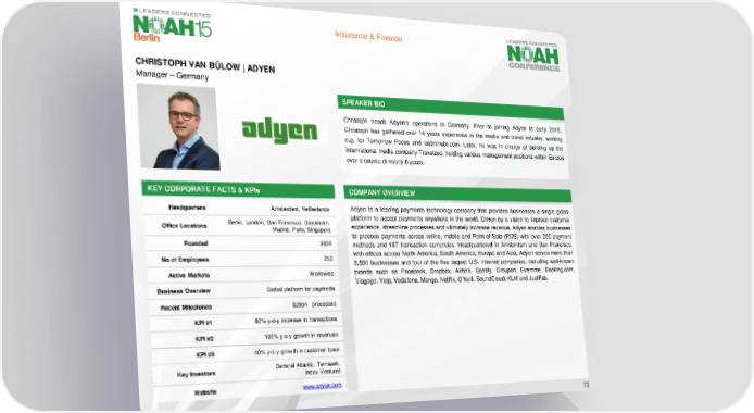Insurance & Finance CHRISTOPH VAN BÜLOW| ADYEN Manager – Germany SPEAKER BIO Christoph heads Adyen’s operations in Germany. Prior to joining Adyen in early 2015, Christoph has gathered over 14 years experience in the media and travel industry, working e.g. for Tomorrow Focus and lastminute.com. Later, he was in charge of building up the international media company Travelzoo, holding various management positions within Europe over a course of nearly 8 years. KEY CORPORATE FACTS& KPIs COMPANY OVERVIEW Headquarters Amsterdam, Netherlands Adyen is a leading payments technology company that provides businesses a single global Berlin, London, San Francisco, Stockholm, platform to accept payments anywhere in the world. Driven by a vision to improve customer Office Locations Madrid, Paris, Singapore experience, streamline processes and ultimately increase revenue, Adyen enables businesses to process payments across online, mobile and Point-of-Sale (POS) with over 250 payment Founded 2006 methods and 187 transaction currencies. Headquartered in Amsterdam and San Francisco, No of Employees 250 with offices across North America, South America, Europe and Asia, Adyen serves more than 3,500 businesses and four of the five largest U.S. Internet companies, including well-known Active Markets Worldwide brands such as Facebook, Dropbox, Airbnb, Spotify, Groupon, Evernote, Booking.com, Viagogo, Yelp, Vodafone, Mango, Netflix, O’Neill, SoundCloud, KLM and JustFab. Business Overview Global platform for payments Recent Milestones $25bn processed KPI#1 80% y-o-y increase in transactions KPI #2 100% y-o-y growth in revenues KPI #3 40% y-o-y growth in customer base Key Investors General Atlantic, Temasek, Index Ventures Website www.adyen.com 73