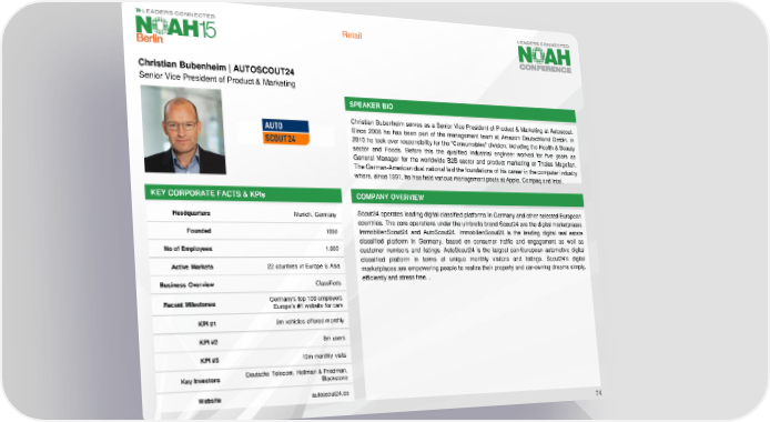 Retail Christian Bubenheim | AUTOSCOUT24 Senior Vice President of Product & Marketing SPEAKER BIO Christian Bubenheim serves as a Senior Vice President of Product & Marketing at Autoscout. Since 2008 he has been part of the management team at Amazon Deutschland GmbH. In 2010 he took over responsibility for the “Consumables” division, including the Health & Beauty sector and Foods. Before this the qualified industrial engineer worked for five years as General Manager for the worldwide B2B sector and product marketing at Thales Magellan. The German-American dual national laid the foundations of his career in the computer industry where, since 1991, he has held various management posts at Apple, Compaq and Intel. KEY CORPORATE FACTS& KPIs COMPANY OVERVIEW Headquarters Munich, Germany Scout24 operates leading digital classified platforms in Germany and other selected European countries. The core operations under the umbrella brand Scout24 are the digital marketplaces Founded 1998 ImmobilienScout24 and AutoScout24. ImmobilienScout24 is the leading digital real estate classified platform in Germany, based on consumer traffic and engagement as well as Noof Employees 1,000 customer numbers and listings. AutoScout24 is the largest pan-European automotive digital Active Markets 22 countries in Europe & Asia classified platform in terms of unique monthly visitors and listings. Scout24’s digital marketplaces are empowering people to realize their property and car-owning dreams simply, Business Overview Classifieds efficiently and stress free. . Recent Milestones Germany’s top 100 employers Europe’s #1 website for cars KPI#1 2m vehicles offered monthly KPI #2 8m users KPI #3 10m monthly visits Key Investors Deutsche Telecom, Hellman & Friedman, Blackstone Website autoscout24.de 74
