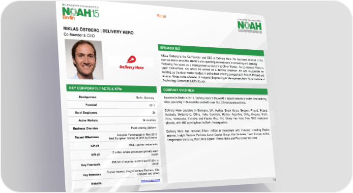 Retail NIKLAS ÖSTBERG | DELIVERY HERO Co-founder & CEO SPEAKER BIO Niklas Östberg is the Co-Founder and CEO of Delivery Hero. He has been involved in the start-up scene since the late 90’s after spending several years in consulting and banking. Following five years as a management consultant at Oliver Wyman, he co-founded Pizza.nu (later OnlinePizza. se) where he served as a full-time chairman. He was responsible for building up the clear market leaders in online food ordering companies in Poland, Finland and Austria. Niklas holds a Master of Industrial Engineering & Management from Royal Institute of TechnologyStockholm & ETH Zurich. KEY CORPORATE FACTS& KPIs COMPANY OVERVIEW Headquarters Berlin, Germany Founded in Berlin in 2011, Delivery Hero is the world’s largest network of online food ordering sites, operating in 34 countries and with over 100,000 restaurant partners. Founded 2011 No of Employees 2k Delivery Hero operates in Germany, UK, Austria, South Korea, Sweden, Finland, Poland, Australia, Switzerland, China, India, Colombia, Mexico, Argentina, Chile, Uruguay, Brazil, Active Markets 34 countries Peru, Venezuela, Panama and Puerto Rico. The Group has more than 1000 employees globally, with 400 working from its Berlin Headquarters. Business Overview Food ordering platform Acquired Yemeksepeti in May 2015 Delivery Hero has received $1bn+ million in investment with investors including Rocket Recent Milestones Best European Startup of 2014 by Emerce Internet, Insight Venture Partners, Luxor Capital Group, Kite Ventures, Team Europe, ru-Net, TengelmannVentures,Point Nine Capital, Vostok Nafta and Phenomen Ventures. KPI#1 100k+ partner restaurants KPI #2 10 million orders processed globally each month Key Financials €88.5m of revenue in 2014 and €150m in 2015E Key Investors Rocket Internet, Insight Venture Partners, Kite Ventures and others Website deliveryhero.com 76