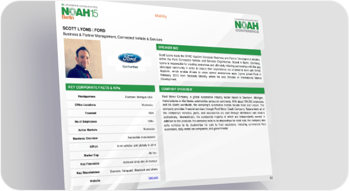 Mobility SCOTT LYONS | FORD Business & Partner Management, Connected Vehicle & Services SPEAKER BIO Scott Lyons leads the SYNC AppLink European Business and Partner Development initiative within the Ford Connected Vehicle and Services Organisation. Based in Berlin, Germany, Lyons is responsible for creating awareness and ultimately initiating partnerships with the app developer community in order to ensure their experiences are enabled to work with SYNC AppLink, which enable drivers to voice control smartphone apps. Lyons joined Ford in February 2013 from Motorola Mobility where he was Director of International Market Development KEY CORPORATE FACTS& KPIs COMPANY OVERVIEW Headquarters Dearborn, Michigan USA Ford Motor Company, a global automotive industry leader based in Dearborn, Michigan, manufactures or distributes automobiles across six continents. With about 194,000 employees Office Locations Worldwide and 66 plants worldwide, the company’s automotive brands include Ford and Lincoln. The company provides financial services through Ford Motor Credit Company. Substantially all of Founded 1904 the company’s vehicles, parts, and accessories are sold through distributors and dealers (collectively, ‘dealerships’), the substantial majority of which are independently owned. In No of Employees 194k+ addition to the products the company sells to its dealerships for retail sale, the company also sells vehicles to its dealerships for sale to fleet customers, including commercial fleet Active Markets Worldwide customers,daily rental car companies, and governments Business Overview Automobile manufacturer KPI#1 6.4m vehicles sold globally in 2014 Market Cap 60.7bn Key Financials Achieved $135.8bn of revenue Key Shareholders Evercore, Vanguard, Blackrock and others Website ford.com 92