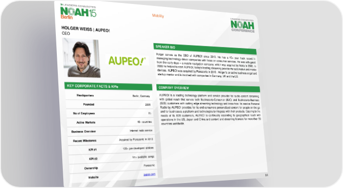 Mobility HOLGER WEISS | AUPEO! CEO SPEAKER BIO Holger serves as the CEO of AUPEO! since 2010. He has a 15+ year track record in managing technology driven companies with focus on consumer services. He was with gate5 from the early days – a mobile navigation company, which was acquired by Nokia in 2006. In 2008 he helped to start AUPEO!, today's leading streaming provider for automotive and mobile devices. AUPEO! was acquired by Panasonic in 2013 . Holger is an active business angel and startup mentor and is involved with companies in Germany, UK and the US KEY CORPORATE FACTS& KPIs COMPANY OVERVIEW Headquarters Berlin, Germany AUPEO! is a leading technology platform and service provider for audio content streaming with global reach that serves both Business-to-Consumer (B2C) and Business-to-Business Founded 2008 (B2B) customers with cutting edge streaming technology and know-how. Its service Personal Radio by AUPEO! provides for its end-consumers personalized content for people on the go No of Employees 25 and for businesses a platform and technologies to integrate with their products. Catering to the needs of its B2B customers, AUPEO! is continually expanding its geographical reach with Active Markets 40+ countries operations in the US, Japan and China and content and streaming licenses for more than 50 countries worldwide. Business Overview Internet radio service Recent Milestones Acquired by Panasonic in 2013 KPI#1 120+ pre-developed stations KPI #2 1m+ available songs Ownership Panasonic Website aupeo.com 94