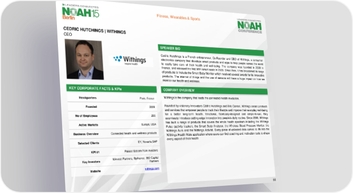 Fitness, Wearables& Sports CEDRIC HUTCHINGS | WITHINGS CEO SPEAKER BIO Cedric Hutchings is a French entrepreneur, Co-Founder and CEO of Withings, a consumer electronics company that develops smart products and apps to help people across the world to easily take care of their health and well-being. The company was founded in 2008 in France, and released the first WiFi smart scale in 2009. Since then, it has broadened its range of products to include the Smart Baby Monitor which received several awards for its innovative products. The internet of things and the use of sensors will have a huge impact on how we monitor our health and wellness. KEY CORPORATE FACTS& KPIs COMPANY OVERVIEW Headquarters Paris, France Withingsis the company that leads the connected-healthrevolution. Founded 2009 Founded by visionary innovators Cédric Hutchings and Eric Carreel, Withings create products and services that empower people to track their lifestyle and improve their everyday well-being No of Employees 200 for a better long-term health. Emotional, flawlessly-designed and simple-to-use, they seamlessly introduce cutting-edge innovation into people’s daily routine. Since 2009, Withings Active Markets Europe, USA has built a range of products that covers the whole health spectrum including the Withings Pulse (activity tracker), the Smart Body Analyzer, the Wireless Blood Pressure Monitor, the Business Overview Connected health and wellness products Withings Aura and the Withings Activité. Every piece of collected data comes to life into the Withings Health Mate application where users can find coaching and motivation tools to shape Selected Clients EY, Novartis,SAP every aspect of their health KPI#1 Raised $33.8m from investors Key Investors Idinvest Partners, Bpifrance, 360 Capital Partners Website withings.com 98