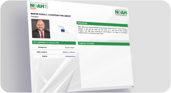 MARTIN SCHULZ | EUROPEAN PARLIAMENT President SPEAKER BIO Martin Schulz was elected President of the European Parliament on 17 January 2012 for a mandate of two and half years with 387 votes. On 1 July 2014 he was re-elected President with 409 votes, becoming the first President in the history of the European Parliament to be re-elected for a second term KEY CORPORATE FACTS& KPIs COMPANY OVERVIEW Headquarters Brussels, Belgium Office Locations Strasburg, Luxembourg Website europarl.europa.eu 100