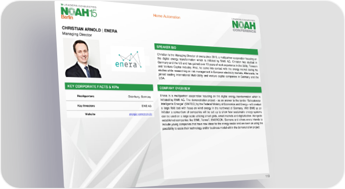 Home Automation CHRISTIAN ARNOLD | ENERA Managing Director SPEAKER BIO Christian is the Managing Director of enera since 2013, a multipartner cooperation focusing on the digital energy transformation which is initiated by EWE AG. Christian has studied in Germanyand the US and has gained over 10 years of work experience in the Utility, Telecom and Venture Capital Industry. First, he came into contact with the energy market during his studies while researching on risk management in European electricity markets. Afterwards, he joined leading international Multi-Utility and venture capital companies in Germany and the USA. KEY CORPORATE FACTS& KPIs COMPANY OVERVIEW Headquarters Oldenburg, Germany Enera is a multipartner cooperation focusing on the digital energy transformation which is initiated by EWE AG. The demonstration project - as an answer to the tender “Schaufenster Key Investors EWE AG Intelligente Energie” (SINTEG) by the Federal Ministry of Economics and Energy - will conduct a large field test with focus on wind energy in the northwest of Germany. With EWE as an Website energie-vernetzen.de initiator a consortium of companies will be set up to show how sustainable energy systems can be used on a large scale utilizing smart grids, smart markets and digitalization. Alongside established companies like EWE, TenneT, ENERCON, Siemens and others enera intends to include young companies that have new ideas for the energy sector and are keen on using the possibility to scale their technology and/or business model within the demonstration project. 113