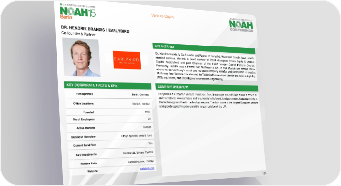 Venture Capital DR. HENDRIK BRANDIS | EARLYBIRD Co-founder & Partner SPEAKER BIO Dr. Hendrik Brandis is Co-Founder and Partner of Earlybird. His current domain focus is web- enabled services. Hendrik is board member of EVCA (European Private Equity & Venture Capital Association) and past Chairman of the EVCA Venture Capital Platform Council. Previously, Hendrik was a Partner with McKinsey & Co., in their Munich and Madrid offices where he led McKinsey's small and mid-sized company initiative and participated in creating McKinsey New Venture. He attended the Technical University of Munich and holds a Dipl.-Ing. (MSc equivalent) and PhD degree in Aerospace Engineering. KEY CORPORATE FACTS& KPIs COMPANY OVERVIEW Headquarters Berlin, Germany Earlybird is a European venture investment firm. It manages around US$1 billion in assets for an international investor base and is currently in its fourth fund generation, focusing mainly on Office Locations Munich, Istanbul the technology and health technology sectors. The firm is one of the largest European venture and growthcapital investors and the largest outside of the UK. Founded 1997 No of Employees 28 Active Markets Europe Business Overview Stage agnostic venture fund Current Fund Size 1bn Key Investments Number 26, Smava, EyeEm Notable Exits carpooling.com, traxpay Website earlybird.com 104