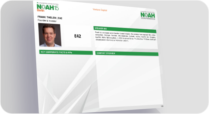 Venture Capital FRANK THELEN | E42 Founder & Investor SPEAKER BIO Frank is a european serial founder & seed investor. His products have reached 100+ million consumers. Startups: Scanbot, 6Wunderkinder, Outbank, myTaxi, hole19, Zen Shopping, E42 kaufDA, Meine Spielzeugkiste. In 2014 he joined Sonys TV prime time TV-Show shark tank (broadcasted in Germany as “Höhle der Löwen”). KEY CORPORATE FACTS & KPIs COMPANY OVERVIEW 106