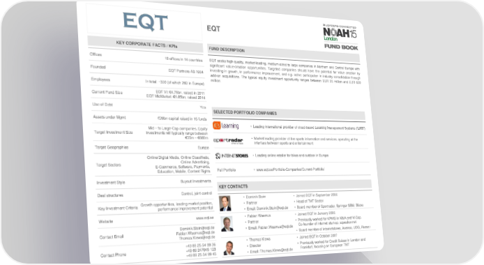 EQT KEY CORPORATE FACTS / KPIs FUND DESCRIPTION Offices 19 offices in 14 countries EQTseeks high-quality, market-leading, medium-sized to large companies in Northern and Central Europe with significant value-creation opportunities. Targeted companies should have the potential for value creation by Founded EQT Partners AB 1994 investing in growth, in performance improvement, and e.g. active participation in industry consolidation through add-on acquisitions. The typical equity investment opportunity ranges between EUR 35 million and EUR 600 Employees In total: ~300 (of which 260 in Europe) million. Current Fund Size EQT VI: €4.75bn, raised in 2011 EQT MidMarket: €1.05bn, raised 2014 Use of Debt Yes SELECTED PORTFOLIO COMPANIES Assets under Mgmt €20bn capital raised in 15 funds Mid – to Large-Cap companies, Equity • Leading international provider of cloud-based Learning Management Systems (“LMS”) Target Investment Size investments will typically range between €35m – €600m • Market leading provider of live sports information and services, operating at the interface between sports and entertainment Target Geographies Europe Online/Digital Media, Online Classifieds, • Leading online retailer for bikes and outdoor in Europe Target Sectors Online Advertising, E-Commerce, Software, Payments, Full Portfolio • www.eqt.se/Portfolio-Companies/Current-Portfolio/ Education, Mobile, Content Rights Investment Style Buyout Investments KEY CONTACTS Deal structures Control, joint control • Dominik Stein • Joined EQT in September 2006 Key Investment Criteria Growth opportunities, leading market position, • Partner • Head of TMT Sector performance improvement potential • Email: [email protected] • Board member of Sportradar, Springer SBM, Blizoo Website www.eqt.se • Fabian Wasmus • Joined EQT in January 2006 [email protected] • Partner • Previously worked for KPMG in M&A and M Cap. Contact Email [email protected] • Email: [email protected] Co-founder of internet start-up, squeaker.net [email protected] • Board member of internetstores, Avenso, UDG, Roeser +49 89 25 54 99 36 • Thomas Klews • Joined EQT in October 2007 Contact Phone +4969 247045 123 • Director • Previously worked for Credit Suisse in London and +49 89 25 54 99 45 • Email: [email protected] Frankfurt, focusing on European TMT