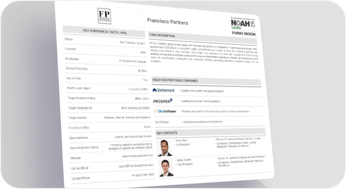 Francisco Partners KEY CORPORATE FACTS / KPIs FUND DESCRIPTION Offices San Francisco, London FP is a leading global private equity firm focused exclusively on investments in technology businesses. With approximately $10 billion in cumulative capital commitments and a team of about 40 investment professionals Founded 1999 working from offices in San Francisco and London, our objective is to work with management teams facing strategic or operational inflection points and to use our differentiated experience, network, and resources to build value for shareholders, employees and customers, thereby generating attractive investment returns for our Employees 44 (of which 8 in Europe) investors. Current Fund Size $2.85bn Use of Debt Yes SELECTED PORTFOLIO COMPANIES Assets under Mgmt In excess of $8bn • Leading online wealth management platform Target Investment Size $50m - $1bn • Leading peer-to-peer financing platform Target Geographies North America and EMEA • Software that optimizes the business practices of service organizations Target Sectors Software, Internet, Services and Systems Full Portfolio • www.franciscopartners.com/investments Investment Style Active Deal structures Control, joint control and minority KEY CONTACTS Providing capital to companies facing • Deep Shah • Prior to FP, worked at Morgan Stanley in London Key Investment Criteria strategic or operational inflection points • Co-President • Companies: ClickSoftware, Kewill, Lumata, Metaswitch Networks, Smartfocus Website www.franciscopartners.com • Mario Razzini • Prior to FP, worked at Citigroup and Arma Partners Contact Email [email protected] • Vice President • Companies: ClickSoftware, Metaswitch Networks, Smartfocus Contact Phone +44 (020) 7907 8600