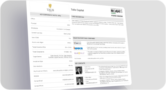Talis Capital KEY CORPORATE FACTS / KPIs FUND DESCRIPTION Offices 1 Talis Capital is a Private Equity and Venture Capital firm based in London. The tech venture arm, Talis Ventures, focuses on B2B business support services and intelligence via data analytics - mainly sold as SaaS. Talis Capital have completed over $350m of transactions since 2009. Founded 2009 Employees 10 (of which 10 in Europe) Current Fund Size Deal by Deal Use of Debt Yes SELECTED PORTFOLIO COMPANIES Assets under Mgmt $150m • One of the world’s fastest-growing cyber threat defence companies and the leader in Enterprise Immune System technology Target Investment Size $1m - $10m • Award winning FinTech company providing instant loans to online retailers to improve their working capital Target Geographies In Digital - Any • The leader in enterprise Digital Customer Experience Analytics, optimising usability, customer engagement and maximising conversion rates of any website across all Cyber Security, FinTech, Data Analytics, mediums Target Sectors Business Support services, Offline-to-Online Full Portfolio • www.taliscapital.com/dv_portfolio Investment Style Active KEY CONTACTS Deal structures Minority • Vasile Foca • His entrepreneurial career began by co-founding INTRESCO Ltd Key Investment Criteria www.taliscapital.com/digital_ventures • Co-founder and MD and Ukraine Capital Partners. Vasile holds an MBA degree from • Email: London Business School. vasile@taliscapital.com • Companies: Darktrace, Reevoo, Iwoca, Clicktale, Navmii, Website www.taliscapital.com ParcelBright, bd4Travel, FuelQuest, ZyTax/Avalara, C3, Cygnet, Talis Shipping, New Era, Centar Contact Email info@taliscapital.com • Matus Maar • Matus has a degree from the University of Manchester and is an • Co-founder and Director active alumni of Singularity University and CISI. • Email: • Companies: Darktrace, Reevoo, Iwoca, Clicktale, Navmii, Contact Phone +44 203 542 6260 matus@taliscapital.com ParcelBright, bd4Travel, www.ThreadsStyling.co.uk, FuelQuest, ZyTax/Avalara, C3