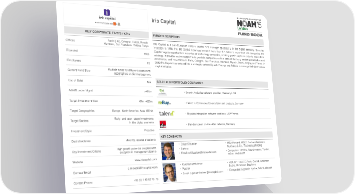 Iris Capital KEY CORPORATE FACTS / KPIs FUND DESCRIPTION Offices Paris (HQ), Cologne, Dubai, Riyadh, Iris Capital is a pan-European venture capital fund manager specializing in the digital economy. Since its Montreal, San Francisco, Beijing, Tokyo inception in 1986, the Iris Capital team has invested more than € 1 billion in more than 230 companies. Iris Founded 1986 Capital targets opportunities in service or technology companies, seeking growth capital in order to realize their strategy. It provides active support to its portfolio companies on the basis of its strong sector specialization and experience, and has offices in Paris, Cologne, San Francisco, Montreal, Riyadh, Dubai, Beijing and Tokyo. In Employees 28 2012 Iris Capital has entered into a strategic partnership with Orange and Publicis to manage their joint venture capital initiative. Current Fund Size Multiple funds for different stages and geographies under management Use of Debt N/A SELECTED PORTFOLIO COMPANIES Assets under Mgmt > €1bn • Search Analytics software provider, Germany/USA Target Investment Size €1m-€20m • Online re-Commerce for entertainment products, Germany Target Geographies Europe, North-America, Asia, MENA • Big data integration software solutions, USA/France Target Sectors Early- and later- stage investments in the digital economy • Pan-European on-line video network, Germany Investment Style Proactive Deal structures Minority, special situations KEY CONTACTS High-growth potential coupled with • Erkan Kilicaslan • MBA Harvard, MSEE Bochum/Bordeaux, Key Investment Criteria exceptional management teams • Partner McKinsey & Co., Technologieholding • Email: [email protected] • Companies: 1-2-3.tv, Searchmetrics, Tyntec, reBuy, Mediakraft Website www.iriscapital.com [email protected] • Curt Gunsenheimer • MBA MIT, ESSEC Paris, Cornell, Goldman Contact Email • Partner Sachs, Robertson Stephens • Email: [email protected] • Companies: Alyotech, Kyriba, Talend, dotsoft Contact Phone +33 (0) 1 45 62 73 73