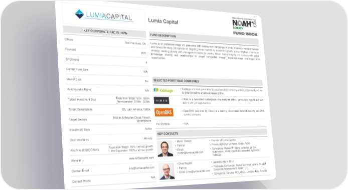 Lumia Capital KEY CORPORATE FACTS / KPIs FUND DESCRIPTION Offices San Francisco, CA Lumia is an expansion-stage VC partnering with leading tech companies in under-invested emerging markets and forward-thinking US companies targeting these markets to accelerate growth. Lumia employs a hands-on strategy, working closely with management teams by pairing Silicon Valley insights and contacts with global Founded 2011 knowledge sharing and relationships to propel companies through expansion-stage challenges and opportunities. Employees 8 Current Fund Size N/A Use of Debt No SELECTED PORTFOLIO COMPANIES Assets under Mgmt N/A • Kabbage is a next generation financial services company utilizing propriety algorithms to extend credit to small businesses online Target Investment Size Expansion Stage: $2m - $20m • Hired is a two-sided marketplace that matches talent, particularly high-skilled tech Pre-expansion: $100k - $500k talent, with job opportunities Target Geographies US, Latin America, EMEA • OpenDNS (acquired by Cisco) is a leading cloud-based network security and DNS Mobile, Enterprise Cloud, Fintech, service company Target Sectors Marketplaces Full Portfolio • N/A Investment Style Active KEY CONTACTS Deal structures Minority • Martin Gedalin • Founder of Lumia Capital Key Investment Criteria Expansion Stage: 50%+ annual growth • Partner • Previously Focus Ventures, Oracle, NCR Pre-Expansion: 100%+ annual growth • Email: • Companies: MarkaVIP, Xtime (acquired by Cox [email protected] Automotive), Hired, OpenDNS (acquired by Cisco), Website www.lumiacapital.com Kabbage Contact Email [email protected] • Chris Rogers • Joined Lumia in 2012 • Partner • Previously Co-founder, Nextel Communications, Head of • Email: [email protected] Corporate Development, Sprint Contact Phone N/A • Companies: Kahuna, Pitzi, Hinge, Lenddo, Telly, Betable