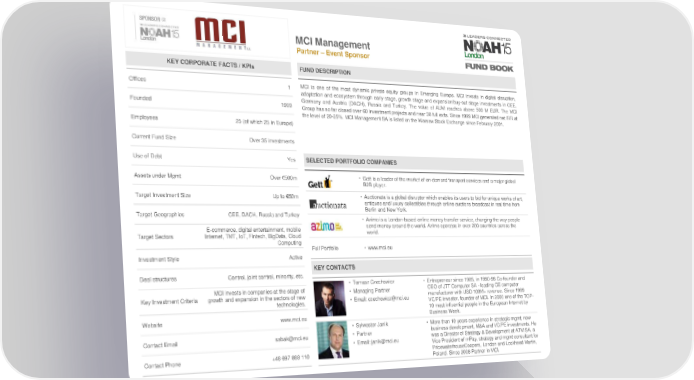 MCI Management Partner – Event Sponsor KEY CORPORATE FACTS / KPIs FUND DESCRIPTION Offices 1 MCI is one of the most dynamic private equity groups in Emerging Europe. MCI invests in digital disruption, adaptation and ecosystem through early stage, growth stage and expansion/buy-out stage investments in CEE, Founded 1999 Germany and Austria (DACH), Russia and Turkey. The value of AUM reaches above 500 M EUR. The MCI Group has so far closed over 60 investment projects and near 30 full exits. Since 1999 MCI generated net IRR at the level of 20-25%. MCI Management SA is listed on the Warsaw Stock Exchange since February 2001. Employees 25 (of which 25 in Europe) Current Fund Size Over 35 investments Use of Debt Yes SELECTED PORTFOLIO COMPANIES Assets under Mgmt Over €500m • Gett is a leader of the market of on-demand transport services and a major global B2B player. Target Investment Size Up to €50m • Auctionata is a global disruptor which enables its users to bid for unique works of art, antiques and luxury collectibles through online auctions broadcast in real time from Berlin and New York. Target Geographies CEE, DACH, Russia and Turkey • Azimois a London-based online money transfer service, changing the way people E-commerce,digital entertainment, mobile send money around the world. Azimo operates in over 200 countries across the Target Sectors Internet, TMT, IoT, Fintech, BigData, Cloud world. Computing Full Portfolio • www.mci.eu Investment Style Active KEY CONTACTS Deal structures Control, joint control, minority, etc. • Tomasz Czechowicz • Entrepreneur since 1985, in 1990-98 Co-founder and MCI invests in companies at the stage of • Managing Partner CEO of JTT Computer SA - leading CE computer Key Investment Criteria growth and expansion in the sectors of new • Email: [email protected] manufacturer with USD 100M+ revenue. Since 1999 technologies. VC/PE investor, founder of MCI. In 2000 one of the TOP- 10 most influential people in the European Internet by Website www.mci.eu Business Week. • Sylwester Janik • More than 10 years experience in strategic mgmt, new Contact Email [email protected] • Partner business development, M&A and VC/PE investments. He • Email: [email protected] was a Director of Strategy & Development at ATM SA, a Vice President of mPay, strategy and mgmtconsultant for Contact Phone +48 697 888 110 PricewaterhouseCoopers, London and Lockheed Martin, Poland. Since 2008 Partner in MCI.