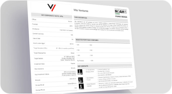 Vito Ventures KEY CORPORATE FACTS / KPIs FUND DESCRIPTION Offices Munich Vito Ventures is an IoT-centered VC fund, investing globally in break-through technology and business innovations. We back ambitious founders and startups applying technology to solve fundamental problems of Founded 2015 society ranging from climate change to industrial security. Vito Ventures is backed by the Viessmann group, a market leading global innovator in energy- and climate-technologies. Our portfolio companies actively leverage the firm’s massive resources and knowledge base ranging from R&D to production and market access. Employees 4 (of which 4 in Europe) Current Fund Size N/A Use of Debt No SELECTED PORTFOLIO COMPANIES Assets under Mgmt $2.3bn • N/A • N/A Target Investment Size €1 - €3m (in rounds up to €10m) • N/A • N/A Target Geographies Global IoT (B2B and B2C) • N/A • N/A Target Sectors Energy & Building Tech Cyber / Industrial Security Full Portfolio • N/A Investment Style Passive KEY CONTACTS Deal structures Minority • Dr. Benedikt Herles • e.ventures Investment Team >€1m annual revenue • Managing Partner • Consultant Bain & Company Key Investment Criteria Globally scalable product • Dr. rer. pol. EBS University Wiesbaden Proven product market fit • Dipl. economics. LMU München Website www.vito.vc • Daria Saharova • Previously: SevenVentures, Holtzbrinck Ventures, Jefferies International, KPMG • Principle • Founder of Bellegs and Munich Founders Contact Email herbert@vito.vc • Dipl. Business Administration, LMU München • Herbert Mangesius • Researcher in network and mathematical systems theory, TU München, UC Louvain Contact Phone N/A • Associate • Dipl. Ing. Mechanical engineering, TU München, École Polytechnique Paris • Hrs MA Technology Management, CDTM