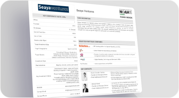 Seaya Ventures KEY CORPORATE FACTS / KPIs FUND DESCRIPTION Offices 1 Seaya Ventures is a Spanish venture fund founded in Madrid in 2013, investing in early and growth stage Internet and technology-enabled businesses in Spain, Latam and Europe. The fund seeks to transform early and Founded 2013 growth stage companies into category leaders. Being entrepreneurs ourselves, we look for innovative businesses that can build a lasting value. We empower outstanding teams and businesses and help them Employees 5 (Europe) navigate from early and growth stages into rapid growth and sustainable profitability. Current Fund Size €40m Use of Debt N/A Assets under Mgmt €40m SELECTED PORTFOLIO COMPANIES Target Investment Size €5m • DIY ticketing platform for Spanish Speaking countries. Target Geographies Spain & LATAM • Online Platform for food delivery and takeout. Computing & Storage Infrastructure, Target Sectors Consumer & Internet Media, Consumer & • Provider of real-time online restaurant reservations for diners; reservation and guest Mobile Media, Enterprise and Consumer, management solutions for restaurants. Software and Services, Internet & Payments Investment Style Active • Digital Marketing Technology and Services to SMEs. Deal structures Majority, minority, control, joint control Full Portfolio • www.seayaventures.com/portfolio/ Deals based in Spain, Latam and Europe KEY CONTACTS Growing companies in need of expansion / growth capital Proven business models that have already • Beatriz González Ordóñez • Workedat Darby Overseas Investments, Excel Key Investment Criteria shown certain level of traction • Founder and Managing Partner Partners, Morgan Stanley, Qarana, Institutional Limited Proceeds used for international expansion, • Email: bg@seayaventures.com Partners Association buy and build strategy and/or simple scale of • Business degree from CUNEF University and an MBA a working model via increased spend in from Columbia Business School (2002) marketing and/or sales Website www.seayaventures.com • Michael Kleindl • Co-founder and CEO of AdLINK Internet Media AG. • Founder and Managing Partner • Successfully invested in and exited companies such as Contact Email info@seayaventures.com • Email: mk@seayaventures.com Zanox.de AG, MAILPROFILER, United MailSolutions AG, Eyewonder Inc., Buy VIP S.L. Contact Phone +34 91 110 86 97 • Current portfolio includes Smartclip Mexico, Crossinx, PayCo, Mediasmart and, above all, Plenummedia
