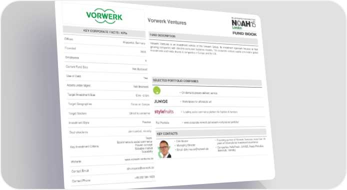 Vorwerk Ventures KEY CORPORATE FACTS / KPIs FUND DESCRIPTION Offices Wuppertal, Germany Vorwerk Ventures is an investment vehicle of the Vorwerk Group. Its investment approach focuses on fast growing companies with direct-to-consumer business models. The corporate venture capital arm makes global Founded 2008 investments and holds shares in companies in Europe and the US. Employees 4 Current Fund Size Not disclosed Use of Debt Yes SELECTED PORTFOLIO COMPANIES Assets under Mgmt Not disclosed • On-demand grocery-delivery service Target Investment Size €1m - €10m • Marketplace for affordable art Target Geographies Focus on Europe Target Sectors Direct to consumer • Leading social commerce platform for fashion & furniture Investment Style Passive Full Portfolio • www.corporate.vorwerk.de/vorwerk-ventures/en/portfolio/ Deal structures Joint control, minority KEY CONTACTS Team Ecommerce & social commerce • Dirk Meurer • Founding partner of Vorwerk Ventures; more than 18 Key Investment Criteria Proven concept • Managing Director years of international investment experience Sizeable market • Email: dirk.meurer@vorwerk.de • Companies: HelloFresh, JUNIQE, Neato Robotics, Scalability MeinAuto, Vaniday Website www.vorwerk-ventures.de Contact Email dirk.meurer@vorwerk.de Contact Phone +49 202 564 1923