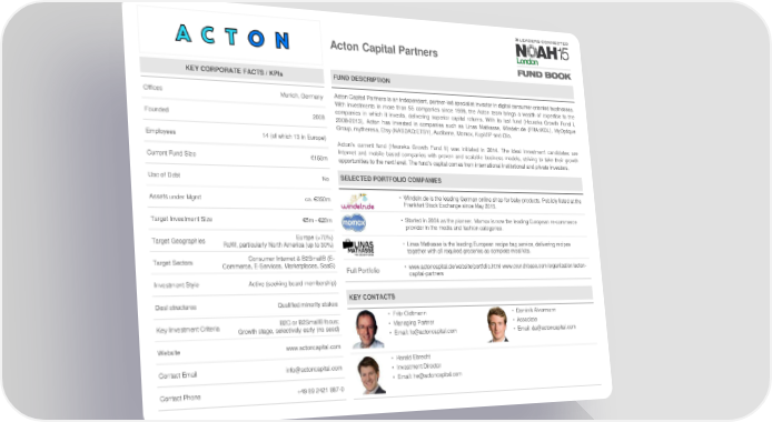 Acton Capital Partners KEY CORPORATE FACTS / KPIs FUND DESCRIPTION Offices Munich, Germany Acton Capital Partners is an independent, partner-led specialist investor in digital consumer-oriented businesses. With investments in more than 55 companies since 1999, the Acton team brings a wealth of expertise to the Founded 2008 companies in which it invests, delivering superior capital returns. With its last fund (Heureka Growth Fund I, 2008-2013), Acton has invested in companies such as Linas Matkasse, Windeln.de (FRA:WDL), MyOptique Group, mytheresa, Etsy (NASDAQ:ETSY),Audibene, Momox, KupiVIP and Clio. Employees 14 (of which 13 in Europe) Acton’s current fund (Heureka Growth Fund II) was initiated in 2014. The ideal investment candidates are Internet and mobile based companies with proven and scalable business models, striving to take their growth Current Fund Size €150m opportunities to the next level. The fund’s capital comes from international institutional and private investors. Use of Debt No SELECTED PORTFOLIO COMPANIES Assets under Mgmt ca. €350m • Windeln.de is the leading German online shop for baby products. Publicly listed at the Frankfurt Stock Exchange since May 2015. Target Investment Size €5m-€20m • Started in 2004 as the pioneer, Momox is now the leading European re-commerce provider in the media and fashion categories. Target Geographies Europe (>70%) RoW, particularly North America (up to 30%) • Linas Matkasse is the leading European recipe bag service, delivering recipes together with all required groceries as complete meal kits. Target Sectors Consumer Internet & B2SmallB (E- Commerce,E-Services, Marketplaces, SaaS) Full Portfolio • www.actoncapital.de/website/portfolio.html www.crunchbase.com/organization/acton- capital-partners Investment Style Active (seeking board membership) Deal structures Qualified minority stakes KEY CONTACTS B2C or B2SmallB focus; • Fritz Oidtmann • Dominik Alvermann Key Investment Criteria Growth stage, selectively early (no seed) • Managing Partner • Associate • Email: [email protected] • Email: [email protected] Website www.actoncapital.com • Harald Ebrecht Contact Email [email protected] • Investment Director • Email: [email protected] Contact Phone +49 89 2421 887-0