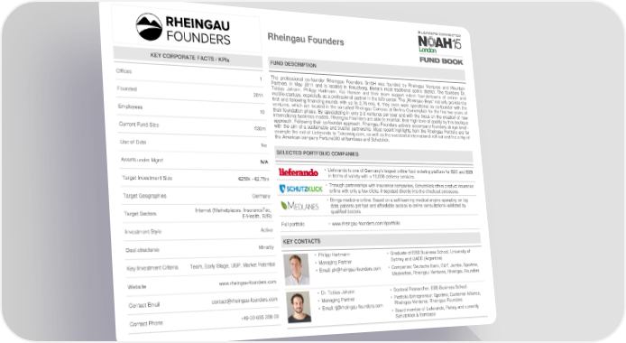 Rheingau Founders KEY CORPORATE FACTS / KPIs FUND DESCRIPTION Offices 1 The professional co-founder Rheingau Founders GmbH was founded by Rheingau Ventures and Mountain Partners in May 2011 and is located in Kreuzberg, Berlin’s most traditional scene district. The founders Dr. Tobias Johann, Philipp Hartmann, Kai Hansen and their team support extern founderteams of online- and Founded 2011 mobile-startups, especially as a professional partner in the b2b sector. The „Rheingau-Boys“ not only provide the first and following financing rounds with up to 2,75 mio. €, they even work operational as co-founder with the ventures, which are located in the so-called Rheingau Campus at Berlins Oranienplatz for the first two years of Employees 10 their foundation phase. By specializing in only 2-3 ventures per year and with the focus on the creation of new international business models, Rheingau Founders are able to maintain their high level of quality by this boutique approach. Following their co-founder approach, Rheingau Founders actively accompany founders at eye level - Current Fund Size €30m with the aim of a sustainable and trustful partnership. Most recent highlights from the Rheingau Portfolio are for example the exit of Lieferando to Takeaway.com, as well as the successful international roll-out and the entry of the American company Fortune500 at Itembase and Schutzlick. Use of Debt No SELECTED PORTFOLIO COMPANIES Assets under Mgmt N/A • Lieferando is one of Germany’s largest online food ordering platform for B2C and B2B Target Investment Size €250k - €2.75m in terms of variety with > 10,000 delivery services. • Through partnerships with insurance companies, Schutzklick offers product insurance online with only a few clicks. Integrated directly into the checkout processes. Target Geographies Germany • Brings medicine online. Based on a self-learning medical engine operating on big Internet (Marketplaces, InsuranceTec, data patients get fast and affordable access to online consultations validated by Target Sectors E-Health, B2B) qualified doctors. Full portfolio • www.rheingau-founders.com/#portfolio Investment Style Active Deal structures Minority KEY CONTACTS • Philipp Hartmann • Graduate of EBS Business School, University of Key Investment Criteria Team, Early Stage, USP, Market Potential • Managing Partner Sydney and UADE (Argentina) • Email: [email protected] • Companies: Deutsche Bank, E&Y, Jamba, Sportme, Website www.rheingau-founders.com Madvertise, Rheingau Ventures, Rheingau Founders Contact Email [email protected] • Dr. Tobias Johann • Doctoral Researcher, EBS Business School • Managing Partner • Portfolio Entrepreneur: Sportme, Customer Alliance, • Email: [email protected] Rheingau Ventures, Rheingau Founders Contact Phone +49-30-695 358 00 • Board member of Lieferando, Rebuy and currently Schutzklick & Itembase