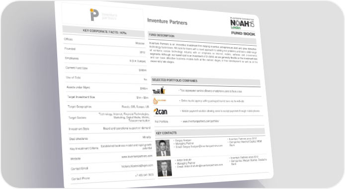 Inventure Partners KEY CORPORATE FACTS / KPIs FUND DESCRIPTION Offices Moscow Inventure Partners is an innovative investment firm helping inventive entrepreneurs start and grow disruptive technology businesses. We look for teams with a novel approach to solving real problems and back a wide range Founded 2012 of ventures across technology industry with an emphasis on internet, mobile, software and e-commerce segments. Although, our sweet spot is an investment of $1-5MM, we are generally flexible on the investment size and can back attractive business models both at the earliest stages of their development as well as at the Employees 8 (8 in Europe) reasonably late stages. Current Fund Size $100m Use of Debt No SELECTED PORTFOLIO COMPANIES Assets under Mgmt $100m • Taxi aggregator service allowing smartphone users to book a taxi Target Investment Size $1m-$5m • Online tourist agency selling packaged tourist tours via its web-site Target Geographies Russia, CIS, Europe, US • Mobile payment solution allowing users to accept payments through mobile phones Technology, Internet, Financial Technologies, Target Sectors Marketing, Digital Media, Mobile, Telecommunication Full Portfolio • www.inventurepartners.com/portfolio/ Investment Style Board and operational support on demand KEY CONTACTS Deal structures Minority • Sergey Azatyan • Inventure Partners since 2012 Key Investment Criteria Established business model and rapid growth • Managing Partner • Companies: Marshall Capital, MDM potential • Email: [email protected] Bank Website www.inventurepartners.com • Anton Inshutin • Inventure Partners since 2012 Contact Email [email protected] • Managing Partner • Companies: Morgan Stanley, Deutsche • Email: [email protected] Bank Contact Phone +7 495 641 3635