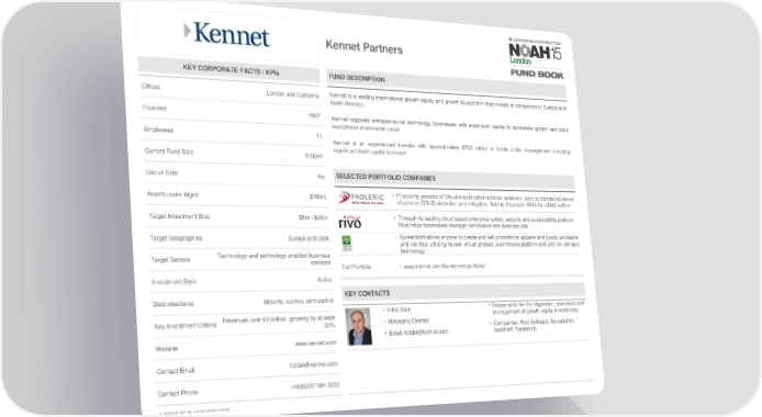 Kennet Partners KEY CORPORATE FACTS / KPIs FUND DESCRIPTION Offices London and California Kennet is a leading international growth equity and growth buyout firm that invests in companies in Europe and North America. Founded 1997 Kennet supports entrepreneurial technology businesses with expansion capital to accelerate growth and build exceptional shareholder value. Employees 11 Kennet is an experienced investor with approximately $700 million in funds under management including significant fresh capital to invest. Current Fund Size €150m1 Use of Debt No SELECTED PORTFOLIO COMPANIES Assets under Mgmt $700m • IT security provider of Cloud-based cyber defense solutions, such as distributed denial- of-service (DDoS) detection and mitigation. Sold to Akamai in 2014 for >$400 million Target Investment Size $8m - $40m • Through its leading cloud based enterprise safety, security and sustainability platform Rivo helps businesses manage compliance and business risk Target Geographies Europe and USA • Spreadshirt allows anyone to create and sell promotional apparel and goods worldwide and risk free; utilizing its own virtual product, ecommerce platform and print on-demand Technology and technology enabled business technology Target Sectors services Full Portfolio • www.kennet.com/the-kennet-portfolio/ Investment Style Active Deal structures Minority, control, joint control KEY CONTACTS • Hillel Zidel • Responsible for the origination, execution and Key Investment Criteria Revenues over €4 million, growing by at least management of growth equity investments. 30% • Managing Director • Companies: Rivo Software, Spreadshirt, • Email: [email protected] NextPerf, Trademob. Website www.kennet.com Contact Email [email protected] Contact Phone +44(0)207 004 3252 1- Represents hard cap. First close at approx €100m