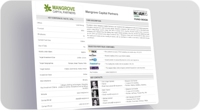 Mangrove Capital Partners KEY CORPORATE FACTS / KPIs FUND DESCRIPTION Offices Luxembourg Founded in 2000, Mangrove Capital Partners is an investment firm dedicated to finding and helping passionate, innovative entrepreneurs start and grow global, disruptive companies. With successes such as Brands4Friends (sold to eBay),Skype (sold to eBay), Wix (IPO in October 2013), KupiVip (Russia's leading luxury e-commerce Founded 2000 company) and FreedomPop (the leading free mobile internet provider in the US), the firm has established itself as one of the pre-eminent early stage investment firms. Mangrove chases bold, transformational ideas around Employees 13 the world and invests across a variety of sectors, with an emphasis on mobile, e-commerce, media technologies and fintech. Current Fund Size $180m Use of Debt No SELECTED PORTFOLIO COMPANIES Assets under Mgmt $650m • Web platform to create HTML5 websites and mobile sites. IPO 2013 • Russia's leading online luxury fashion retailer. Target Investment Size $100k - $15m • Israeli provider of productivity tools for online user experience. Target Geographies Europe, Israel, Russia, India • The leading free mobile internet provider in the US. Target Sectors mobile, ecommerce, media, fintech • The largest Indian online shopping network focused on rural consumers Full Portfolio • www.mangrove.vc Investment Style Active KEY CONTACTS Deal structures Minority • Hans-Jürgen Schmitz • Mangrove Co-Founder Category defining technologies, Disruptive • Partner • 15 years of VC investing Key Investment Criteria product or service, Exceptional and ambitious • Email: [email protected] • Portfolio: Helpling, Outfittery, Storeking founders • Mark Tluszcz • Mangrove Co-Founder Website www.mangrove.vc • Partner • 15 years of VC investing • Email: [email protected] • Portfolio: JobToday, FreedomPop, Wix Contact Email [email protected] • Michael Jackson • With Mangrove since 2007 • Partner • Previously Tele 2, Skype Contact Phone +352 26 25 34-1 • Email: [email protected] • Portfolio: Churchdesk, Nimbuzz, Riddle