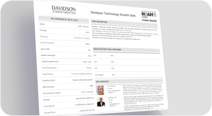 Davidson Technology Growth Debt KEY CORPORATE FACTS / KPIs FUND DESCRIPTION Offices Berlin, Germany Davidson Technology Growth Debt fund provides debt and equity financing to mid/late stage tech and IT companies, in Europe (including Israel) with a focus on Germany Eran Davidson is the only VC veteran (20 yeas and 6 funds under management) in the debt sector, meaning Founded 2014 tons of contacts and experience. Eran’s team include Venture Lending and WallStreet M&A experts Davidson’s investors include top German and Israel family offices. Employees 5 (of which 4 in Europe) Davidson’s loans should bridge the companies to profitability and liquidity event Current Fund Size €100m Use of Debt Yes SELECTED PORTFOLIO COMPANIES Assets under Mgmt N/A N/A • N/A Target Investment Size €3m - €10m N/A • N/A Target Geographies Europe N/A • N/A Target Sectors VC and PE backed companies Full Portfolio • N/A Investment Style Passive, unless help required KEY CONTACTS Deal structures Debt • Eran Davidson • 2005 till to 2013 Eran founded and managed Hasso Plattner Venture group of • Founder funds, which includes HPV Germany, HPV Europe and HPV Africa. From 1996 • Email: eran@davidson- to 2005 Eran co-managed Inventech and Eurofund VC's and was the CEO of Key Investment Criteria €10m in revenues capital.com Proseed Venture Capital fund. Eran is co-founder of Hasso Plattner Capital Eran led over a 100 investments in technology companies, which resulted in more than €1bn in exits volume. Eran lives with his family in Berlin since 2005. Website www.davidson-capital.com • Andreas Frank • Andreas joined Davidson Technology Growth Debt Fund in 2014. Andreas is an • Partner experienced investment professional with more than 20 years tenure. He spent • Email: more than 10 years in Debt Capital Markets in the UK. Prior to Davidson he was Contact Email [email protected] andreas@davidson- a Director at Noble Group, a 100m Euro Venture Debt Fund, and worked for capital.com Deutsche Bank and JnJ. • Andreas graduated Magna Cum Laude with a BA from the University of Applied Contact Phone +49(0)30 521 325 465 Sciences Cologne, Germany, and received an MBA from the School of Management at Cranfield University in Bedfordshire, UK.