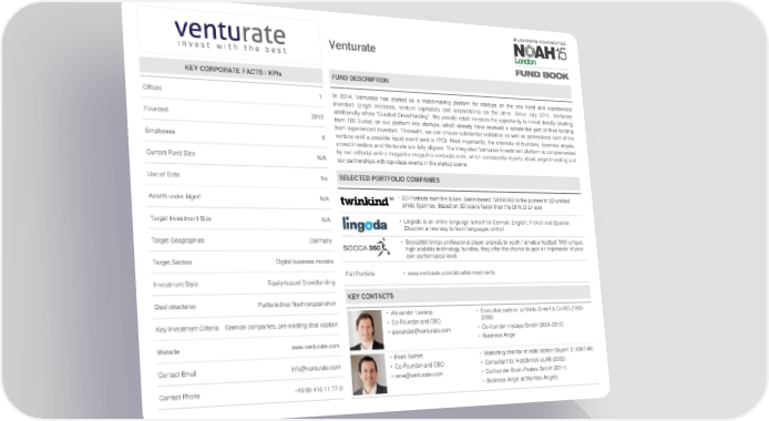 Venturate KEY CORPORATE FACTS / KPIs FUND DESCRIPTION Offices 1 In 2014, Venturate has started as a matchmaking platform for startups on the one hand and experienced investors (angel investors, venture capitalists and corporations) on the other. Since July 2015, Venturate Founded 2013 additionally offers “Curated Crowdfunding”. We provide retail investors the opportunity to invest directly (starting from 100 Euros) on our platform into startups, which already have received a substantial part of their funding from experienced investors. Therewith, we can ensure substantial validation as well as professional care of the Employees 6 venture until a possible liquid event (exit or IPO). Most importantly, the interests of founders, business angels, crowd investors and Venturate are fully aligned. The integrated Venturate investment platform is complemented by our editorial online magazine magazine.venturate.com, which consistently reports about angel investing and Current Fund Size N/A our partnerships with top-class events in the startup scene. Use of Debt No SELECTED PORTFOLIO COMPANIES Assets under Mgmt N/A • 3D Portraits from the future. Berlin-based TWINKIND is the pioneer in 3D-printed photo figurines. Based on 3D scans faster than the blink of an eye. Target Investment Size N/A • Lingoda is an online language school for German, English, French and Spanish. Discover a new way to learn languages online! Target Geographies Germany • Socca360 brings professional player analysis to youth / amateur football. With unique, high scalable technology bundles, they offer the chance to gain an impression of your Target Sectors Digital business models own performance level. Full Portfolio • www.venturate.com/aktuelleinvestments Investment Style Equity-based Crowdfunding Deal structures Partiarisches Nachrangdarlehen KEY CONTACTS • Alexander Lasslop • Executive partner at Voltis GmbH & Co KG (1993- Key Investment Criteria German companies, pre-existing deal captain • Co-Founder and CEO 2000) • [email protected] • Co-founder mydays GmbH (2004-2010) Website www.venturate.com • Business Angel • René Seifert • Marketing director at radio station Bayern 3 (1997-99) Contact Email [email protected] • Co-Founder and CEO • Consultant for Holtzbrinck eLAB (2002) • [email protected] • Co-founder Brain-Pirates GmbH (2011) Contact Phone +4989 416 11 77-0 • Business Angel at Mumbai Angels