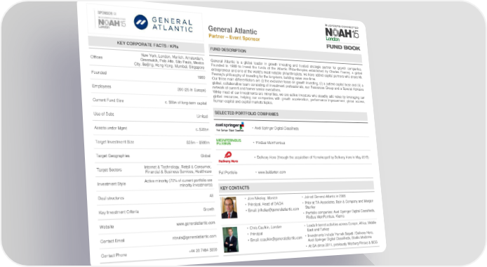 General Atlantic Partner – Event Sponsor KEY CORPORATE FACTS / KPIs FUND DESCRIPTION New York, London, Munich, Amsterdam, General Atlantic is a global leader in growth investing and trusted strategic partner for growth companies. Offices Greenwich, Palo Alto, São Paulo, Mexico Founded in 1980 to invest the funds of the Atlantic Philanthropies established by Charles Feeney, a global City, Beijing, Hong Kong, Mumbai, Singapore entrepreneur and one of the world's most notable philanthropists, we have added capital partners who share Mr. Feeney's philosophy of investing for the long-term, building value over time. Founded 1980 Our three main differentiators are (i) the exclusive focus on growth investing, (ii) a patient capital base and (iii) a global, collaborative team consisting of investment professionals, our Resources Group and a Special Advisors Employees 200 (25 in Europe) network of current and former senior executives. While most of our investments are minorities, we are active investors who steadily add value by leveraging our global resources, helping our companies with growth acceleration, performance improvement, global access, Current Fund Size c. $8bn of long-term capital humancapital and capital markets topics. Use of Debt Limited SELECTED PORTFOLIO COMPANIES Assets under Mgmt c. $20bn • Axel Springer Digital Classifieds Target Investment Size $25m–$500m • FlixBus MeinFernbus Target Geographies Global • Delivery Hero (through the acquisition of Yemeksepeti by Delivery Hero in May 2015) Target Sectors Internet & Technology, Retail & Consumer, Financial & Business Services, Healthcare Full Portfolio • www.balderton.com Investment Style Active minority (70% of current portfolio are minority investments) KEY CONTACTS Deal structures All • Jörn Nikolay, Munich • Joined General Atlantic in 2008 Key Investment Criteria Growth • Principal, Head of DACH • Prior at TA Associates, Bain & Company and Morgan • Email: [email protected] Stanley • Portfolio companies: Axel Springer Digital Classifieds, Website www.generalatlantic.com FlixBus MeinFernbus, Klarna • Chris Caulkin, London • Leads Internet activities across Europe, Africa, Middle Contact Email [email protected] • Principal East and Turkey • Email: [email protected] • Investments include Yemek Sepeti / Delivery Hero, Axel Springer Digital Classifieds, Studio Moderna Contact Phone +4420 7484 3200 • At GA since 2011, previously Warburg Pincus & BCG