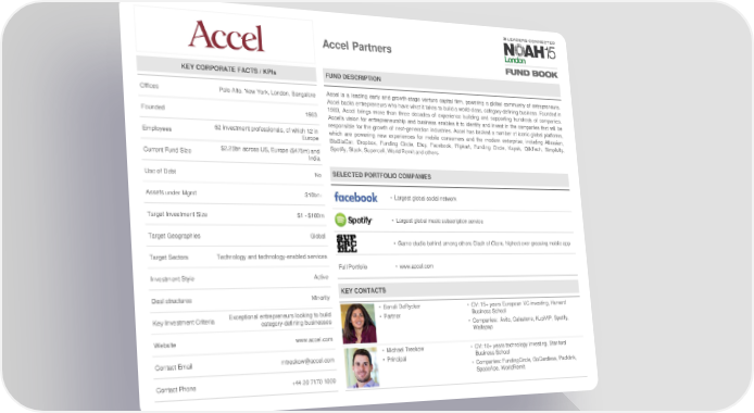 Accel Partners KEY CORPORATE FACTS / KPIs FUND DESCRIPTION Offices Palo Alto, New York, London, Bangalore Accel is a leading early and growth-stage venture capital firm, powering a global community of entrepreneurs. Accel backs entrepreneurs who have what it takes to build a world-class, category-defining business. Founded in Founded 1983 1983, Accel brings more than three decades of experience building and supporting hundreds of companies. Accel's vision for entrepreneurship and business enables it to identify and invest in the companies that will be responsible for the growth of next-generation industries. Accel has backed a number of iconic global platforms, Employees 52 investment professionals, of which 12 in which are powering new experiences for mobile consumers and the modern enterprise, including Atlassian, Europe BlaBlaCar, Dropbox, Funding Circle, Etsy, Facebook, Flipkart, Funding Circle, Kayak, QlikTech, Simplivity, $2.25bn across US, Europe ($475m) and Spotify, Slack, Supercell, World Remit and others. Current Fund Size India Use of Debt No SELECTED PORTFOLIO COMPANIES Assets under Mgmt $10bn+ • Largest global social network Target Investment Size $1 - $100m • Largest global music subscription service Target Geographies Global • Game studio behind among others Clash of Clans, highest ever grossing mobile app Target Sectors Technology and technology-enabled services Full Portfolio • www.accel.com Investment Style Active Deal structures Minority KEY CONTACTS Exceptional entrepreneurs looking to build • Sonali DeRycker • CV: 15+ years European VC investing, Harvard Key Investment Criteria category-defining businesses • Partner Business School • Companies: Avito, Calastone, KupiVIP, Spotify, Wallapop Website www.accel.com • Michael Treskow • CV: 10+ years technology investing, Stanford Contact Email [email protected] • Principal Business School • Companies: FundingCircle, GoCardless, Packlink, Contact Phone +44 20 7170 1000 SpaceApe, WorldRemit