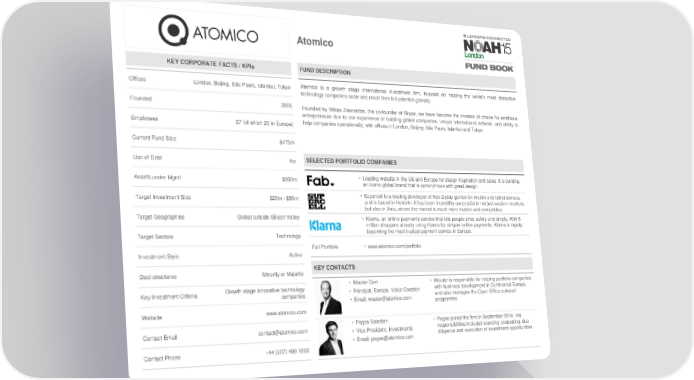 Atomico KEY CORPORATE FACTS / KPIs FUND DESCRIPTION Offices London, Beijing, São Paulo, Istanbul, Tokyo Atomico is a growth stage international investment firm, focused on helping the world’s most disruptive technology companies scale and reach their full potential globally. Founded 2006 Founded by Niklas Zennström, the co-founder of Skype, we have become the investor of choice for ambitious entrepreneurs due to our experience of building global companies, unique international network, and ability to Employees 27 (of which 23 in Europe) help companies operationally, with offices in London, Beijing, São Paulo, Istanbul and Tokyo. Current Fund Size $475m Use of Debt No SELECTED PORTFOLIO COMPANIES Assets under Mgmt $850m • Leading website in the US and Europe for design inspiration and sales. It is building an iconic global brand that is synonymous with great design. Target Investment Size $20m-$50m • Supercell is a leading developer of free-2-play games for mobile and tablet devices, and is based in Helsinki. It has been incredibly successful in not just western markets, but also in Asia, where the market is much more mature and competitive. Target Geographies Global outside Silicon Valley • Klarna, an online payments service that lets people shop safely and simply. With 6 million shoppers already using Klarna for simpler online payments, Klarna is rapidly Target Sectors Technology becoming the most trusted payment service in Europe. Full Portfolio • www.atomico.com/portfolio Investment Style Active Deal structures Minority or Majority KEY CONTACTS Growth stage innovative technology • WouterGort • Wouteris responsible for helping portfolio companies Key Investment Criteria companies • Principal, Europe, Value Creation with business development in Continental Europe, • Email: wouter@atomico.com and also manages the Open Office outreach programme Website www.atomico.com • Pogos Saiadian • Pogos joined the firm in September 2010. His Contact Email contact@atomico.com • Vice President, Investments responsibilities included sourcing, evaluating, due • Email: pogos@atomico.com diligence and execution of investment opportunities Contact Phone +44 (207) 499 1093
