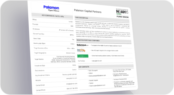 PalamonCapital Partners KEY CORPORATE FACTS / KPIs FUND DESCRIPTION Offices London Palamon is a Pan-European growth equity provider with over 15 years track record of investing in fast growing mid-sized businesses. Palamon has invested 1.1 billion euros in over 35 companies in partnership with Founded 1999 entrepreneurs. Palamon is a thematic investor, focusing on secular trends that fuel growth in services businesses across technology, retail, financial and business services. Employees 27 (of which 27 in Europe) In the technology space, we have completed and continue to pursue investments in e-commerce companies taking advantage of the offline to online channel shift, payment providers exploiting the move from cash to Current Fund Size €670m electronic payments, and enterprise software providers offering applications that improve productivity and reduce operating costs of companies, including SaaS and cloud based solutions. Use of Debt Yes SELECTED PORTFOLIO COMPANIES Assets under Mgmt €530m • The largest online retailer of premium beauty products in the UK Target Investment Size €10m – €80m • One of Europe’s largest on-line designer fashion outlets Target Geographies Western Europe Business and Industrial Services, • Online hotel booking website covering 11,000 hotels across Europe Target Sectors Communications, Consumer Goods and Retail, Energy and Environment, Financial Full Portfolio • www.palamon.com Services, Other, Consumer Services: others Investment Style Active KEY CONTACTS Deal structures Control • Fabio Giuseppetti • Formerly at Bancroft Group, GE Capital, • Partner Chase Manhattan Bank Key Investment Criteria Revenue growth potential • Companies: Retail Decisions, • Email: [email protected] budgetplaces.com, TeamSystem Website www.palamon.com • Ricardo Caupers • Formerly a Principal at BCG Contact Email [email protected] • Partner • Focuses on e-commerce, payments, and • Email: [email protected] enterprise software businesses. Responsible Contact Phone 0044 207 766 2000 for Palamon's investment in feelunique.com, ReDWorldwide.