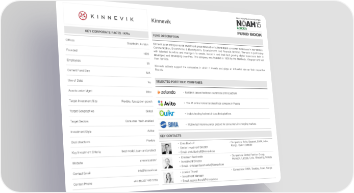 Kinnevik KEY CORPORATE FACTS / KPIs FUND DESCRIPTION Offices Stockholm, London Kinnevik is an entrepreneurial investment group focused on building digital consumer businesses in four sectors: Communication, E-commerce & Marketplaces, Entertainment, and Financial Services. We work in partnership with talented founders and managers to create, invest in and lead fast growing digital businesses both in Founded 1936 developed and developing countries. The company was founded in 1936 by the Stenbeck, Klingspor and von Horn families. Employees 35 Kinnevik actively support the companies in which it invests and plays an influential role on their respective Boards. Current Fund Size N/A Use of Debt No SELECTED PORTFOLIO COMPANIES Assets under Mgmt $9bn • Europe’s largest fashion e-commerce online platform Target Investment Size Flexible, focused on growth • The #1 online horizontal classifieds company in Russia Target Geographies Global • India’s leading horizontal classifieds platform Target Sectors Consumer / tech-enabled • Mobile-led microinsurance product for consumers in emerging markets Investment Style Active KEY CONTACTS Deal structures Flexible • Chris Bischoff • Companies: Avito, Bayport, BIMA, Iroko, Key Investment Criteria Best model, team and product • Senior Investment Director Konga, Quikr, Saltside • Email: [email protected] Website kinnevik.se/en/ • Christoph Barchewitz • Companies: Global Fashion Group, • Investment Director Home24, Lazada, Linio, Westwing, Wimdu Contact Email [email protected] • Email: [email protected] • Jessica Thorell • Companies: BIMA, Dealdey, Iroko, Konga Contact Phone +44 (0) 207 440 5760 • Investment Manager • Email: [email protected]