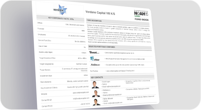 VerdaneCapital VIII K/S KEY CORPORATE FACTS / KPIs FUND DESCRIPTION Offices Oslo, Stockholm and Helsinki Verdane VIII has the flexibility to invest in either a complete portfolio, parts of a portfolio or a single company. The fund primarily seeks to invest in growth companies in Northern Europe, active in the IT, energy and advanced industrial sectors. Founded 1985 Verdane Capital Advisors is the exclusive investment advisor to Verdane funds. Its ' goal is to always deliver more than capital. The team invests the time required to thoroughly understand the opportunities and challenges Employees 22 (of which 22 in Europe) facing each business and to help devise structured action plans to address those. The team has deep sector knowledge and more general ownership experience from over 250 companies acquired since 2003. Verdane VIII is backed by international blue-chip investors, with a strong appetite for co-investment, meaning Current Fund Size Skr 2bn (€220m) there is ample capital available to fund large deals. Use of Debt No SELECTED PORTFOLIO COMPANIES Assets under Mgmt €700m • Online fashion specifically targeted at women 25-45 Target Investment Size €10m - €50m • PIM (Product Information Management) for omni-channel B2B and B2C Target Geographies Northern Europe • Complete online grocer that also provides “grocery bags” with recipes Target Sectors E-commerce, IT, energy and advanced industrials Full Portfolio • www.verdanecapital.com/kategori/7/holdings.html Investment Style Active KEY CONTACTS Deal structures Minority, control and joint control • Henrik Aspén • Companies: EasyPark, Eleven and previously • Partner Codenomicon Key Investment Criteria Assets with high growth potential • Email: [email protected] Website www.verdanecapital.com • Pål Malmros • Companies: eBuilder, Newscycle and NYX • Partner • Email: [email protected] Contact Email [email protected] • Staffan Mörndal • Companies: Boozt, Caliroots, Mathem, Liaison and • Partner MM Sports Contact Phone +46 407 42 00 • Email: [email protected]
