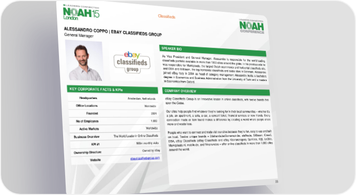 Classifieds ALESSANDRO COPPO| EBAY CLASSIFIEDS GROUP General Manager SPEAKER BIO As Vice President and General Manager, Alessandro is responsible for the world-leading classifieds portfolio available in more than 1000 cities around the globe. In his previous role he was responsible for Marktplaats, the largest Dutch ecommerce and horizontal classifieds site, and DBA and BilBasen, the top horizontal classifieds and autos sites in Denmark. Alessandro joined eBay Italy in 2004 as head of category management Alessandro holds a bachelors degree in Economics and Business Administration from the University of Turin and a masters in Economics from Oxford. KEY CORPORATE FACTS& KPIs COMPANY OVERVIEW Headquarters Amsterdam, Netherlands eBay Classifieds Group is an innovative leader in online classifieds, with twelve brands that spantheGlobe. Office Locations Worldwide Founded 2004 Our sites help people find whatever they’re looking for in their local communities – whether it’s a job, an apartment, a sofa, a car, a concert ticket, financial services or new friends. Every No of Employees 1,000 connection made or item found makes a difference by creating a world where people share moreandwasteless. Active Markets Worldwide Business Overview The World Leader in Online Classifieds People who want to connect and trade visit our sites because they’re fun, easy to use and built on trust. Twelve unique brands – 2dehands.be/2ememain.be, alaMaula, BilBasen, Close5, KPI #1 990m monthly visits DBA, eBay Classifieds (eBay Classifieds and eBay Kleinanzeigen), Gumtree, Kijiji, LoQUo, Marktplaats.nl, mobile.de, and Vivanuncios – offer online classifieds in more than 1,000 cities Ownership Structure Owned by eBay around the world. Website ebayclassifiedsgroup.com 25