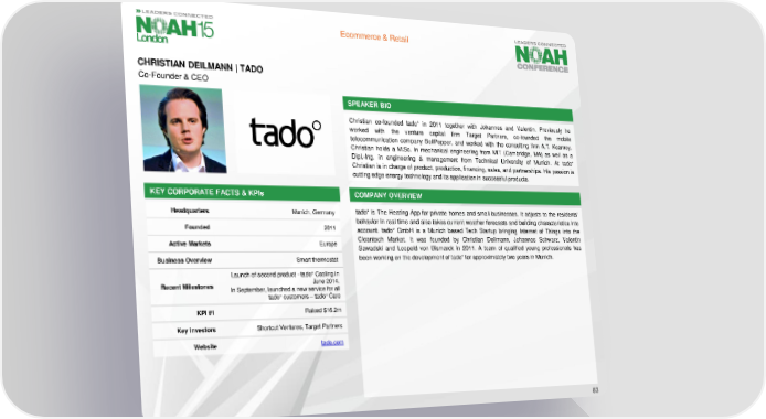 Ecommerce & Retail CHRISTIAN DEILMANN | TADO Co-Founder & CEO SPEAKER BIO Christian co-founded tado° in 2011 together with Johannes and Valentin. Previously he worked with the venture capital firm Target Partners, co-founded the mobile telecommunication company BellPepper, and worked with the consulting firm A.T. Kearney. Christian holds a M.Sc. in mechanical engineering from MIT (Cambridge, MA) as well as a Dipl.-Ing. in engineering & management from Technical University of Munich. At tado° Christian is in charge of product, production, financing, sales, and partnerships. His passion is cutting edge energy technology and its application in successful products. KEY CORPORATE FACTS& KPIs COMPANY OVERVIEW Headquarters Munich, Germany tado° is The Heating App for private homes and small businesses. It adjusts to the residents' behavior in real time and also takes current weather forecasts and building characteristics into Founded 2011 account. tado° GmbH is a Munich based Tech Startup bringing Internet of Things into the Active Markets Europe Cleantech Market. It was founded by Christian Deilmann, Johannes Schwarz, Valentin Sawadski and Leopold von Bismarck in 2011. A team of qualified young professionals has Business Overview Smart thermostat beenworking on the developmentof tado° for approximately two years in Munich. Launch of second product - tado° Cooling in Recent Milestones June 2014. In September, launched a new service for all tado° customers – tado° Care KPI#1 Raised $16.2m Key Investors Shortcut Ventures, Target Partners Website tado.com 83