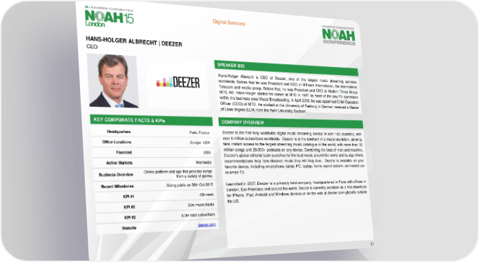 Digital Services HANS-HOLGER ALBRECHT| DEEZER CEO SPEAKER BIO Hans-Holger Albrecht is CEO of Deezer, one of the largest music streaming services worldwide. Before that he was President and CEO of Millicom International, the international Telecom and media group. Before that, he was President and CEO at Modern Times Group MTG AB. Hans-Holger started his career at MTG in 1997 as head of the pay-TV operations within the business area Viasat Broadcasting. In April 2000, he was appointed Chief Operation Officer (COO) of MTG. He studied at the University of Freiburg in German received a Master of Laws degree (LLM) from the Ruhr University Bochum. KEY CORPORATE FACTS& KPIs COMPANY OVERVIEW Headquarters Paris, France Deezer is the first truly worldwide digital music streaming service in over 180 countries, with over 6 million subscribers worldwide. Deezer is at the forefront of a music revolution, allowing Office Locations Europe, USA fans instant access to the largest streaming music catalogue in the world, with more than 35 Founded 2006 million songs and 20,000+ podcasts on any device. Combining the best of man and machine, Deezer's global editorial team searches for the best music around the world and its algorithmic Active Markets Worldwide recommendations help fans discover music they will truly love. Deezer is available on your favorite device, including smartphone, tablet, PC, laptop, home sound system, connected car Business Overview Online platform and app that provides songs or smart TV. from a variety of genres Recent Milestones Going public on 30th Oct 2015 Launched in 2007, Deezer is a privately held company, headquartered in Paris with offices in London, San Francisco and around the world. Deezer is currently available as a free download KPI #1 40k news for iPhone, iPad, Android and Windows devices or on the web at deezer.com globally outside KPI #2 35m musictracks the US. KPI #2 6.3m total subscribers Website deezer.com 21