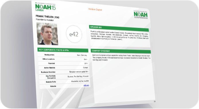 Venture Capital FRANK THELEN| E42 Founder & Investor SPEAKER BIO Frank is an European serial founder & seed investor. His products have reached 100+ million consumers. Startups: Scanbot, 6Wunderkinder, Outbank, myTaxi, hole19, Zen Shopping, kaufDA, Meine Spielzeugkiste. In 2014 he joined Sonys TV prime time TV-Show shark tank (broadcastedin Germany as “Höhle der Löwen”). KEY CORPORATE FACTS& KPIs COMPANY OVERVIEW Headquarters Bonn, Germany E42 is an European venture capital firm led by Frank Thelen, Marc Sieberger and Alex Koch. The company invests in Europe-based startups, its selected investments include Scanbot, The Office Locations Bonn Golf App and Viovendi. Founded 2011 Active Markets Europe Business Overview European venture capital firm KeyPortfolio Scanbot, The Golf App, Viovendi Companies Notable Exits Wunderlist, myTaxi, kaufDA Website e42.com 24