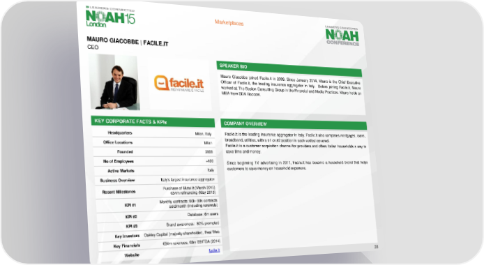 Marketplaces MAURO GIACOBBE| FACILE.IT CEO SPEAKER BIO Mauro Giacobbe joined Facile.it in 2009. Since January 2014, Mauro is the Chief Executive Officer of Facile.it, the leading insurance aggregator in Italy. Before joining Facile.it, Mauro worked at The Boston Consulting Group in the Financial and Media Practices. Mauro holds an MBAfromSDABocconi. KEY CORPORATE FACTS& KPIs COMPANY OVERVIEW Headquarters Milan, Italy Facile.it is the leading insurance aggregator in Italy. Facile.it also compares mortgages, loans, Office Locations Milan broadband,utilities, with a #1 or #2 position in each vertical covered. Facile.it is a customer acquisition channel for providers and offers Italian households a way to Founded 2008 save time and money. No of Employees +400 Since beginning TV advertising in 2011, Facile.it has become a household brand that helps Active Markets Italy customersto save moneyon householdexpenses. Business Overview Italy's largest insurance aggregator Recent Milestones Purchase of Mutui.it (March 2015) €34mrefinancing (May 2015) KPI #1 Monthly contracts: 80k- 90k contracts sold/month (including renewals) KPI #2 Database: 6m users KPI #3 Brand awareness: 80% prompted Key Investors Oakley Capital (majority shareholder), Real Web KeyFinancials €34mrevenues, €8m EBITDA (2014) Website facile.it 28